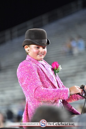SHELBYVILLE, Tenn. – The first Thursday night of The Celebration is always full of promise as the Two-Year-Old Mare spilt and the Owner-Amateur Two-Year-Old split showcase the newest generation of great walking horses. The show got underway at precisely 7PM, with Mark Farrar welcoming White Diamond Dollar and Vicki Self into the show ring. Andy Keffer of First Church of the Nazarene gave the invocation, and James Wells of Franklin did a beautiful rendition of the national anthem. Sunny, mild weather brought with it the excitement for 14 competitive classes.