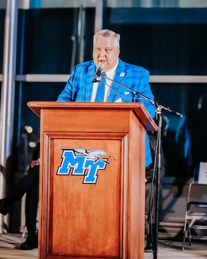 Throughout his years in Shelbyville, Chip also maintained close ties with MTSU Athletics. He would still do some broadcasting and travel with the teams, while maintaining his horse show schedule. It was very rare that the two overlapped, but it did happen on occasion. One such instance was in 2005, which Chip remembered fondly. On September 3, 2005, MTSU was scheduled to play a midday game in Tuscaloosa, Alabama, against the Crimson Tide. The night before, Chip was in center ring, concluding the second championship night of The Celebration, culminating in Jamie Bradshaw’s victory aboard Jose’s Intimidator in the Four-Year-Old World Grand Championship. The next morning, Chip hopped in a van at 5:30 a.m. and left with the team to head down for the game. Kickoff was at 11 a.m., and as soon as the game concluded, the movie heist portion of this story kicks into gear. A school donor had flown some boosters down to Tuscaloosa for the game, and agreed to let Chip have a seat on the return flight. “As soon as the game is over,” Chip said, “we get off the air, and he's waiting in the car right at the bottom of the elevator at Bryant-Denny Stadium. We jump in the car, go to the Tuscaloosa Airport, and get in this eight-seater, twin-engine plane. We fly to Bomar Field in Shelbyville. My Mom and Dad,” it should be noted, a man who sharpened probably a million pocketknives over the years at The Celebration, “had moved my car to the little terminal there, and my tuxedo for Saturday night was in the back of the car. There was a check beforehand to make sure there was a shower at the airport. We took off at 4, and we landed in Shelbyville at 5:30. I take a quick shower, put my tuxedo on and I was at The Celebration grounds by 6:20 for a seven o'clock show.”