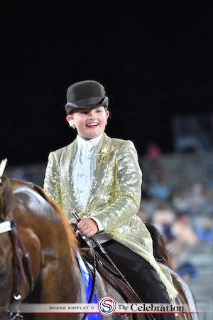This team is undefeated this year with wins at the WHTA National Trainers’ Show, Spring Extravaganza, Walking For Cancer and Heart Of A Champion. Smiling to a reserve world championship was 2024 world champions in the division, The Dixie Label and Wyatt Puckett for Mike and Casey Tracy of Blakely, Georgia. The Dixie Label is a repeat winner at The Celebration, already having five world championships and two world grand championships, all in youth divisions. Taking third place on the judges’ cards was I’m Shady with Bentlee Baum in the irons for Lisa Baum.