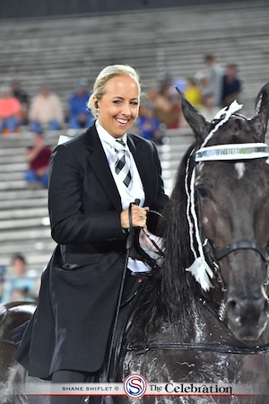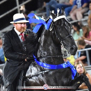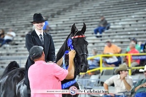 SHELBYVILLE, Tenn. – It was horse show time once again in Shelbyville. The first Friday night of The Celebration always brings with it the first of the Fine Harness classes and the exciting split of the Three-Year-Old Stallions. Dubbed Wild West Night at The Celebration, the evening’s festivities began promptly at 7PM. Mark Farrar announced the flag bearer, White Diamond Dollar and Hall of Fame rider Vicki Self. Following the presentation of the colors, Eddie Reed of Living Stones Community Church gave the invocation. Nichole Waggoner of Bell Buckle sang the national anthem. Thereafter, it was time for the first of the 13 classes to enter the ring.